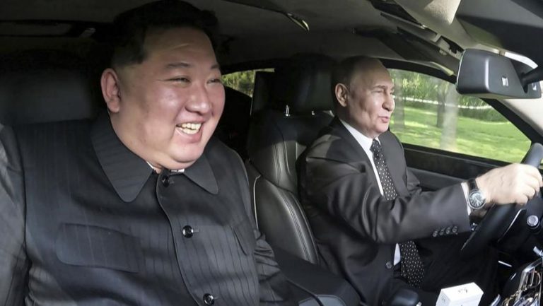 Foto: Presiden Rusia Vladimir Putin dan Pemimpin Korea Utara Kim Jong Un...