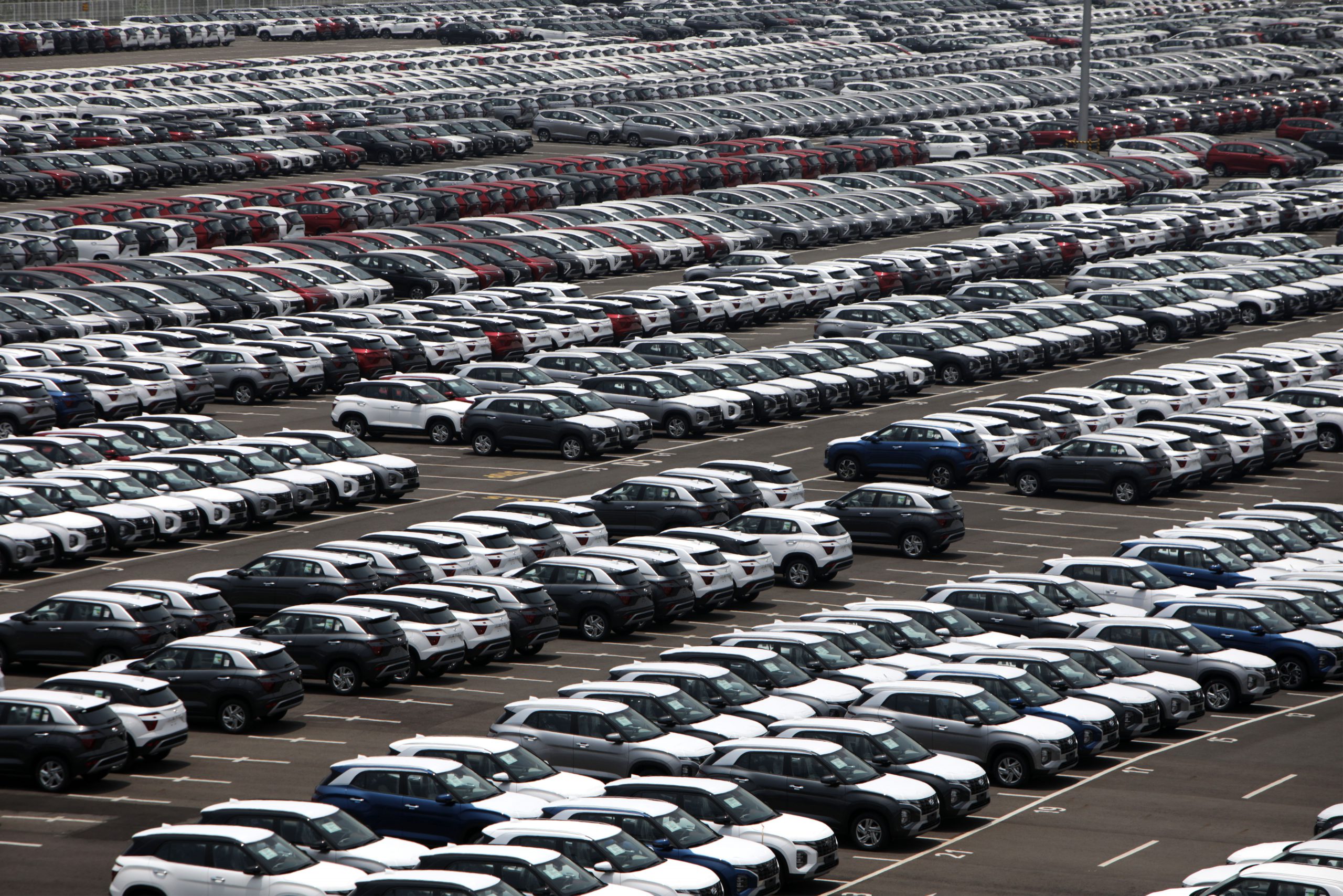 Deretan mobil yang selesai diproduksi di Pabrik Hyundai, Cikarang, Bekasi, Jawa Barat, Sabtu (18/2/2023). Menurut data Gabungan Industri Kendaraan Bermotor Indonesia produksi kendaraan sepanjang 2022 mencapai 1,3 juta. Angka ini lebih tinggi dibanding produksi 2019 (sebelum pandemi) yang hanya 1,28 juta unit. Selain pasar dalam negeri yang besar, produksi kendaraan juga untuk pasar ekspor. Ekspor kendaraan roda empat naik cukup tajam dari tahun 2021 ke tahun 2022, naik dari 300.000 unit ke hampir 600.000 unit. KOMPAS/HERU SRI KUMORO 18-02-2023